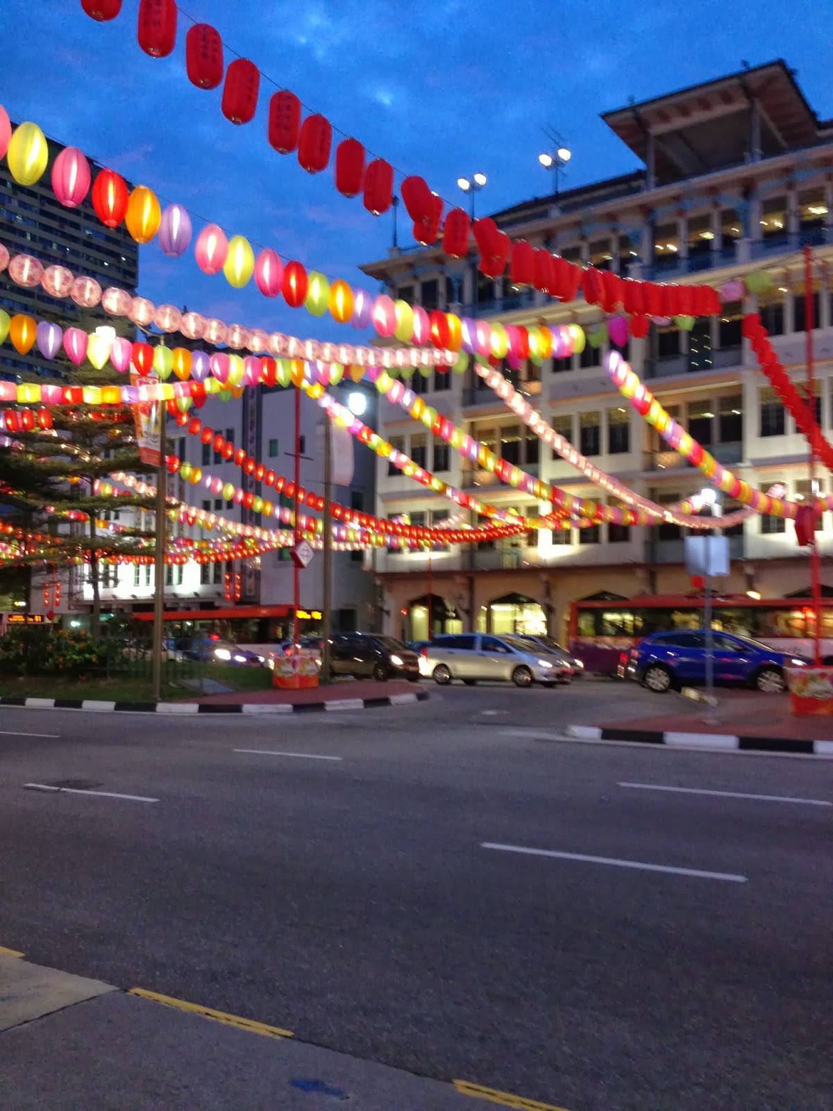 I headed to Chinatown at 6:30 on Thursday. After my experience at the Gardens by the Bay the previous evening, I knew it didn't pay to be early. As I walked past the food court, I noticed many more people gathering with friends to partake of a meal together. Unfortunately, I didn't know if this was unusual, because I'm usually home making our dinner at that time. I thought of accosting people and doing a reporter on the spot, to find out what they would do to celebrate the Mid Autumn Festival that evening. Two things prevented me from doing that. First, many Singaporeans are not sure what to make of me already, and, second, many people in Chinatown don't speak English as a first language. But, as I wandered around Chinatown, taking pictures of the thousands of lanterns, I noticed many people from many cultures doing the same thing.